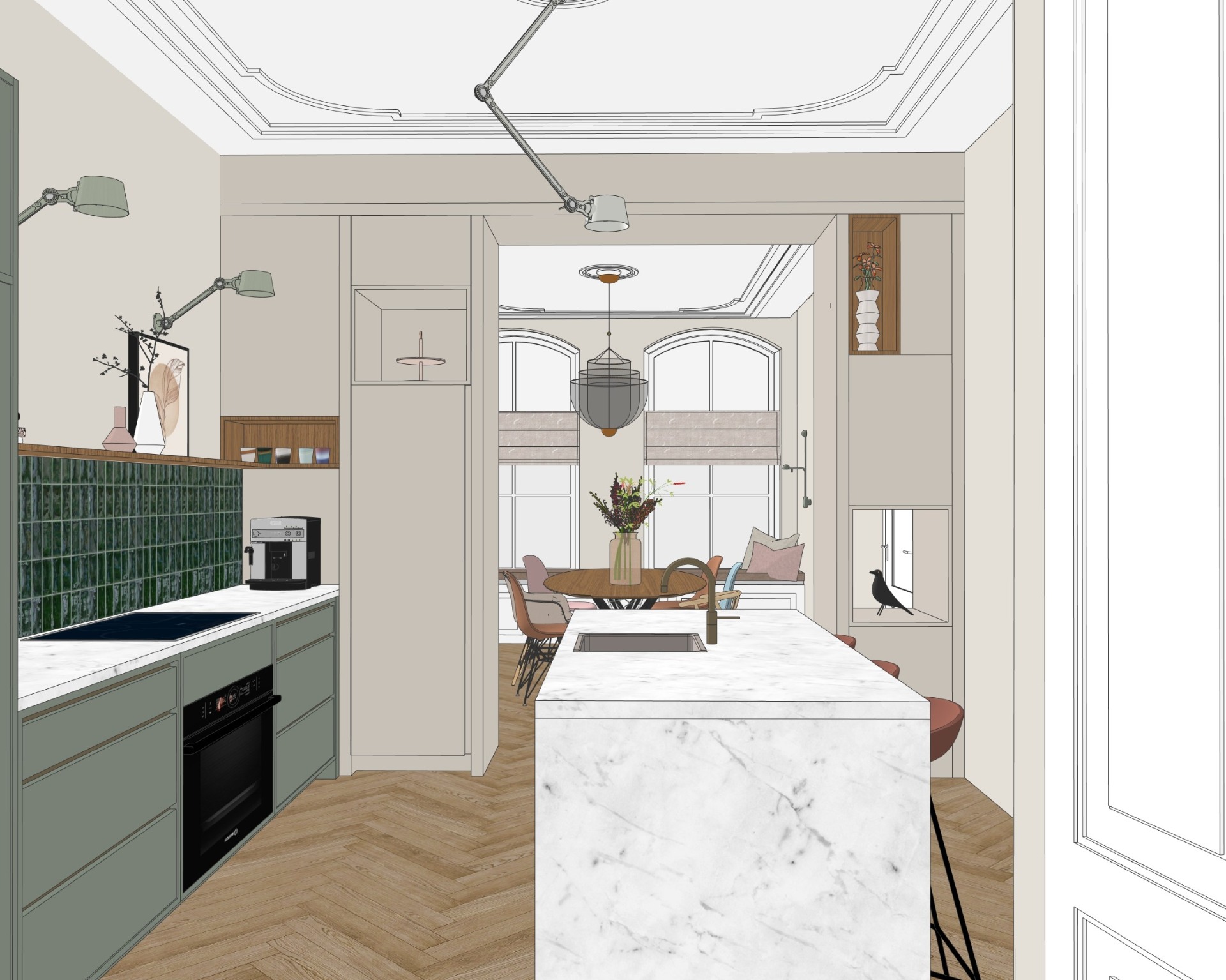 - Tussen de eethoek en de keuken is een maatwerk ensuite kast ontworpen waar een deel van de functionaliteiten van de keuken in is verwerkt.