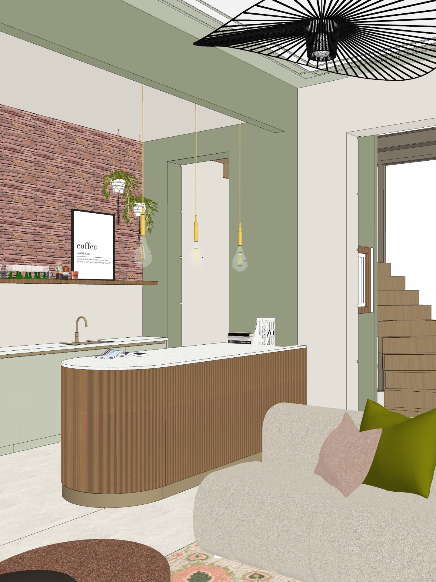 - De prachtige rauwe muur met schoon metselwerk in de tuinkamer hebben we behouden en is een blikvanger boven de groene pantry geworden.